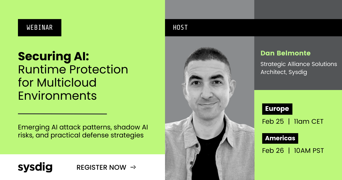 Join Sysdig's Dan Belmonte as he breaks down emerging attack patterns, regulatory and governance drivers, and actionable approaches for securing AI and cloud workloads. He'll also explore how AI-powered security can help teams detect threats earlier, prioritise what matters most, and respond faster than ever.